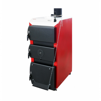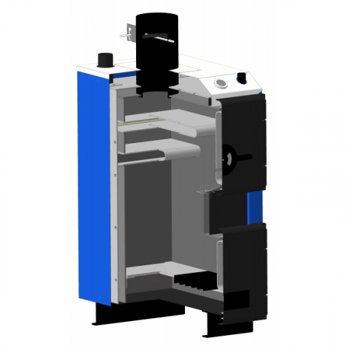 Большой размер камеры сгорания позволяет загрузить больше топлива, чем достигается более длительное горение при одной загрузке от 6 до 10 часов. С помощью регулируемой заслонки подачи вторичного воздуха на дверце камеры сгорания осуществляется дожиг пиролизных газов, образующихся в процессе горения, таким образом, повышается КПД котла. Котел можно монтировать как в открытых системах отопления с естественной циркуляцией теплоносителя, так и закрытых системах с принудительной циркуляцией.